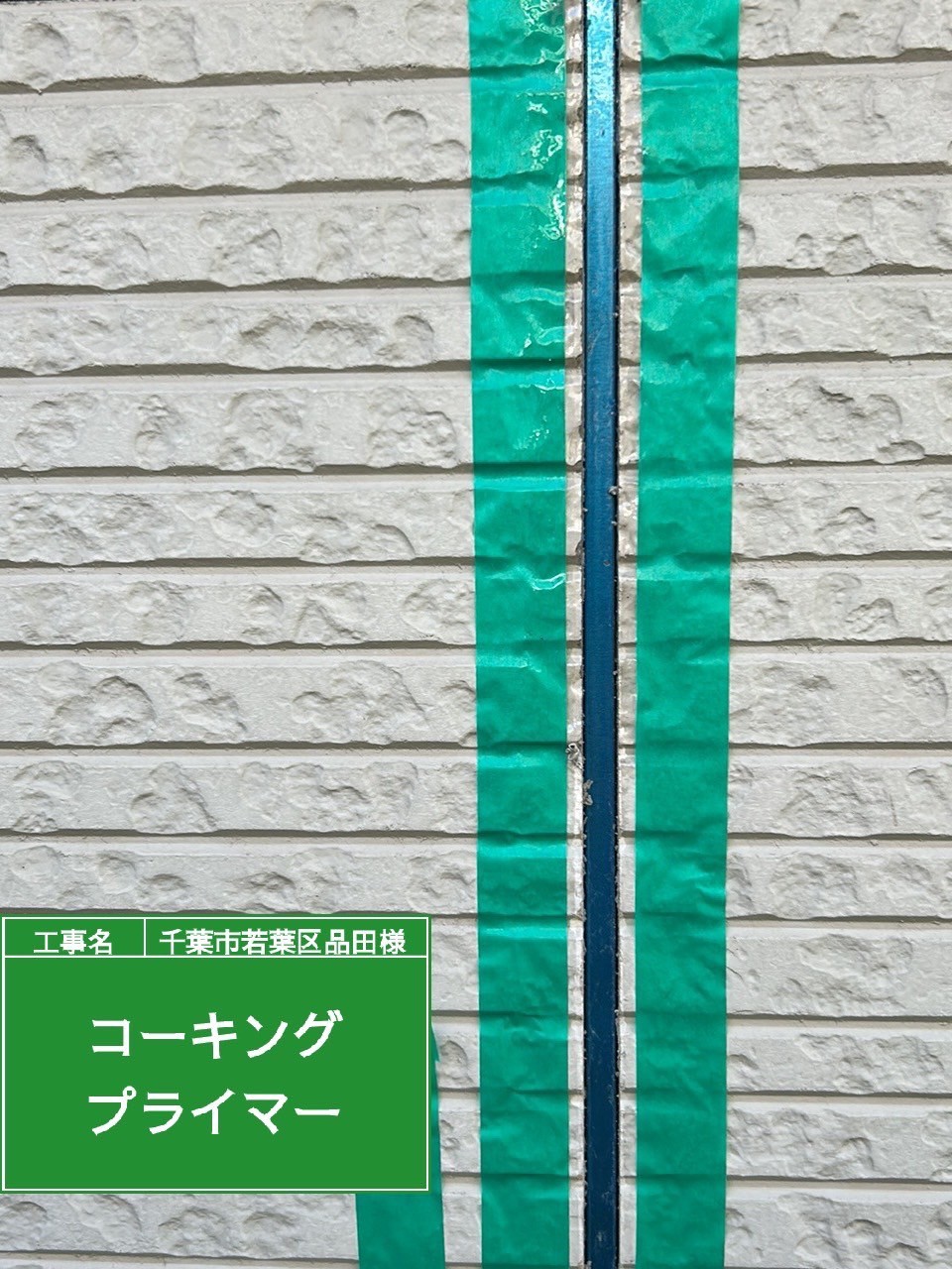 古いコーキングの撤去が完了した後は、新しいコーキング材の密着性を高めるために、プライマーの塗布作業を行いました。プライマーは接着剤のような役割を果たし、目地部分にハケで丁寧に塗り込んでいきます。