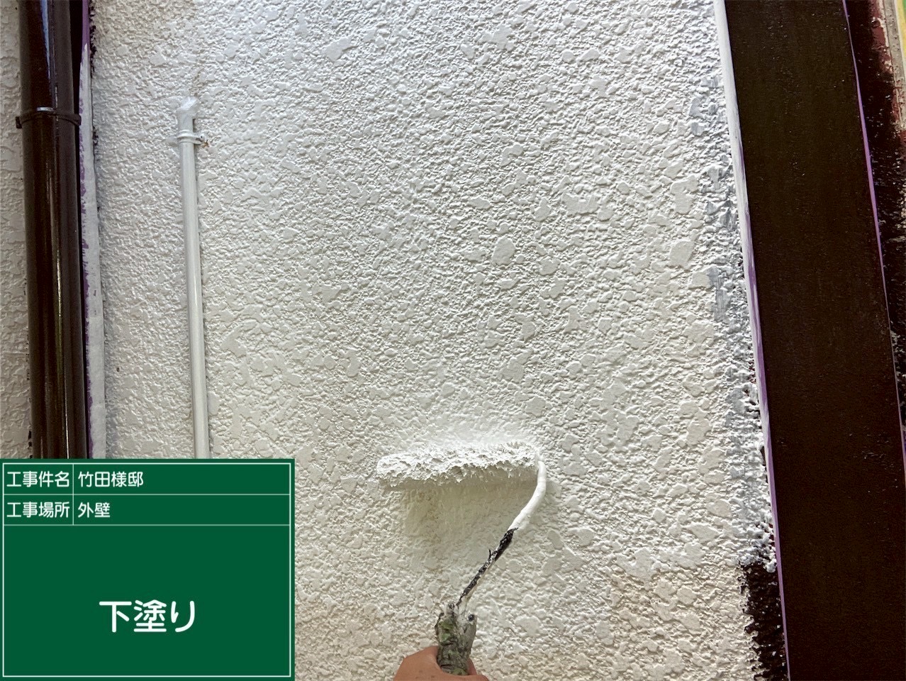 次に、外壁の下塗り作業を行います。下塗りは、外壁と仕上げ塗料をしっかり密着させるための重要な工程です。専用の下塗り材を丁寧に塗布し、ムラなく均一に仕上げることで、この後の中塗り・上塗りの美しさと耐久性を大きく高めます。