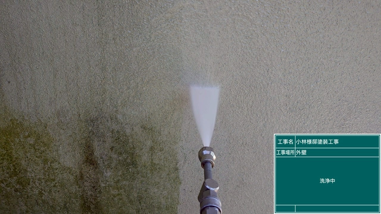 外壁全体に付着した汚れやカビ、コケ、古い塗膜を高圧の水流で丁寧に洗い流していきます。 強力な水圧によって、表面だけでなく細かな凹凸や目地部分の汚れまでしっかり除去することで、新しい塗料が密着しやすい下地を整えます。