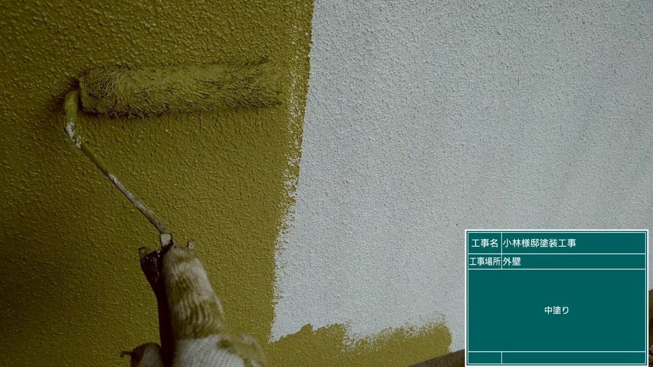 外壁の中塗りでは、下塗りで整えた下地の上から指定色の塗料を均一に塗り重ねていきます。 中塗りは仕上げ塗装の一層目として、色や質感を整えるとともに、塗膜の厚みを確保して耐久性を高める重要な工程です。