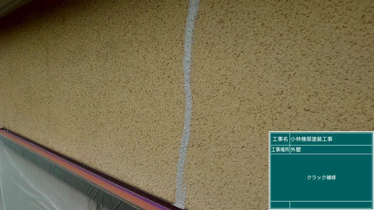 外壁に生じたひび割れ(クラック)部分を丁寧に補修していきます。 まずはひびの周辺を清掃し、補修材がしっかり密着するよう下地を整えます。 その後、専用の補修材を充填し、表面を平らにならすことで、見た目の美しさと防水性を回復させます。
