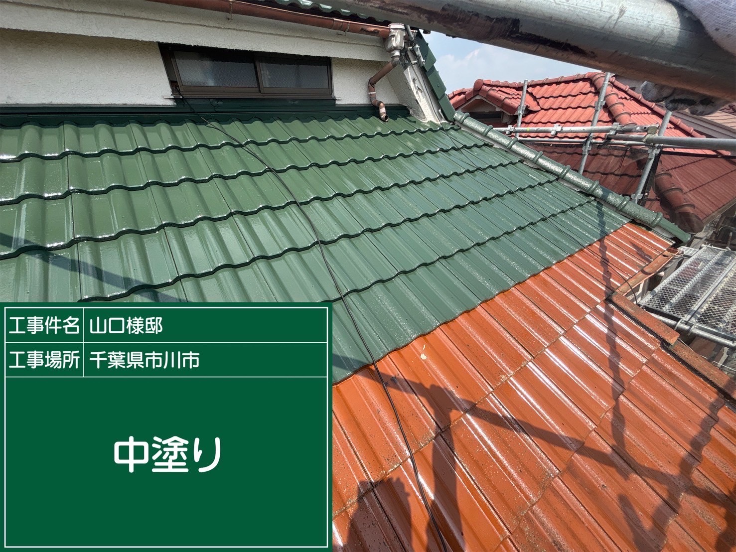 中塗りは、下塗りで整えた下地の上に塗料を重ねる工程で、仕上げ塗装の土台となります。屋根全体に均一に塗料を広げることで、色ムラを防ぎ、耐久性を高める効果があります。