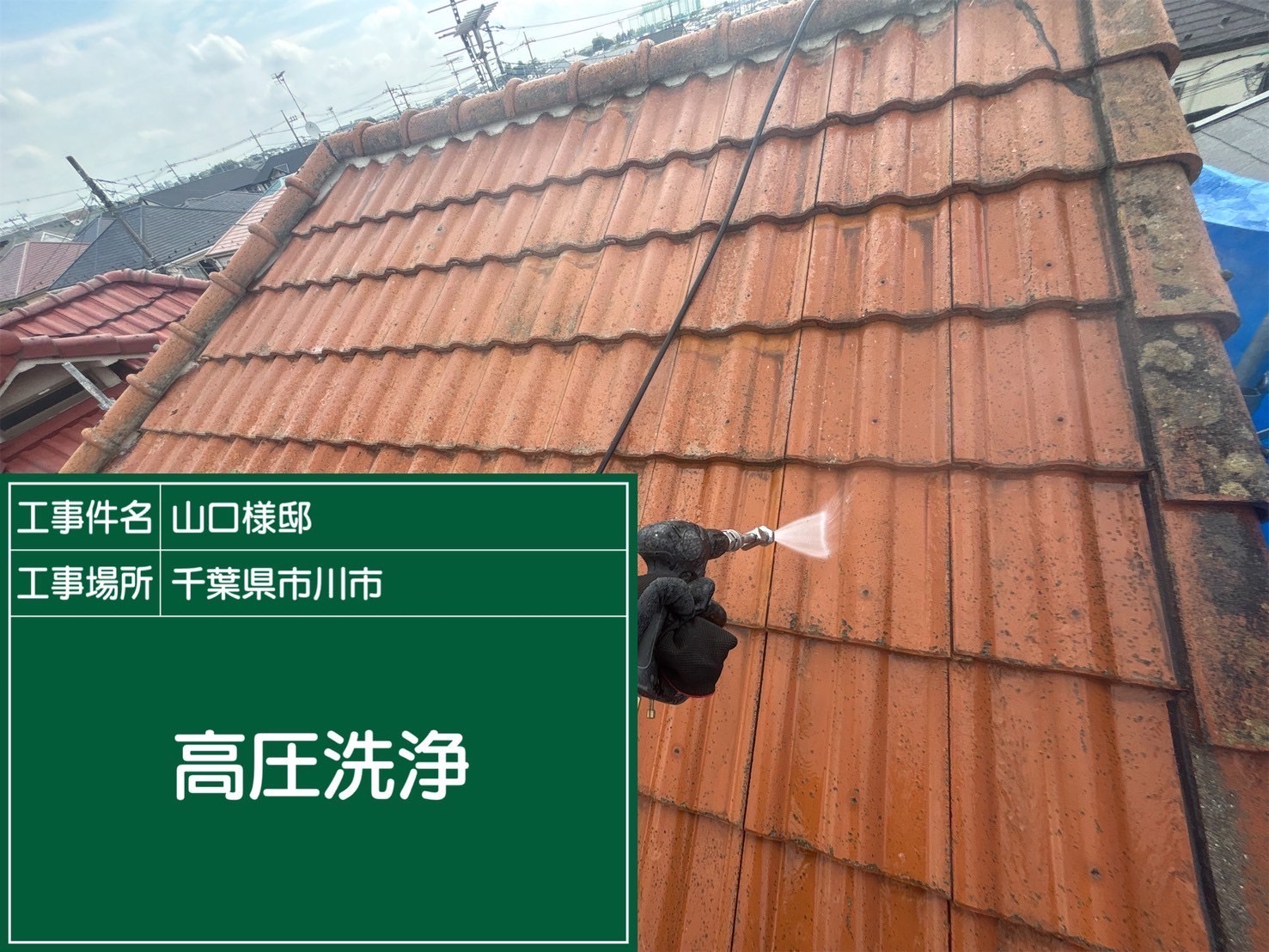 屋根に付着した汚れやコケ、カビ、古い塗膜をしっかり落とすために、高圧洗浄を行っています。 強い水圧で洗い流すことで、表面がきれいになり、後に塗装する塗料がしっかり密着します。