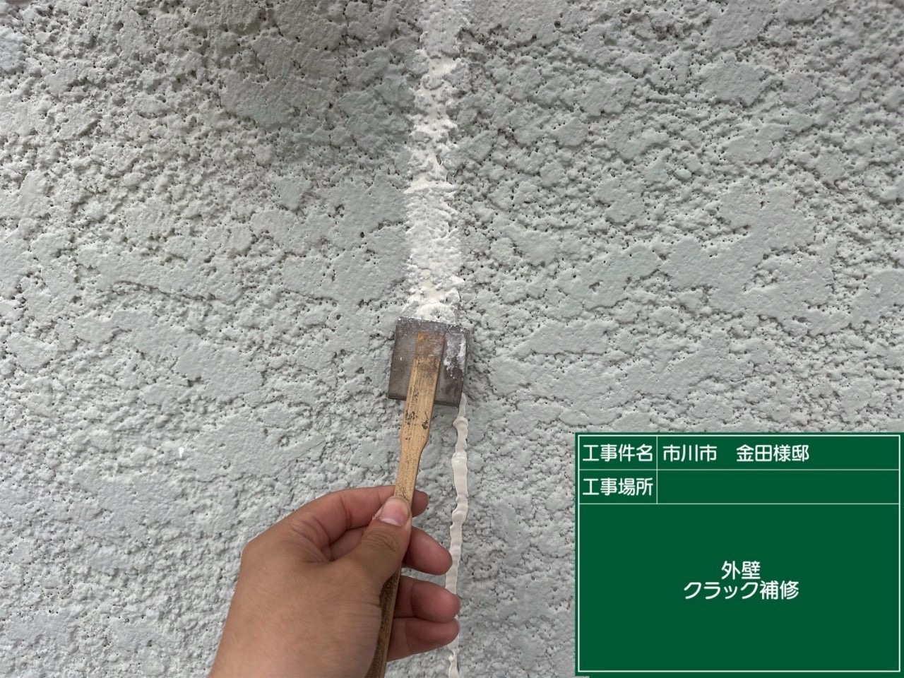 高圧洗浄で外壁をきれいにした後は、クラック(ひび割れ)の補修作業を行います。ひび割れをそのままにしておくと、雨水が浸入して建物内部を傷める原因になるため、補修はとても大切な工程です。専用の補修材をひびに丁寧に充填し、表面をなじませることで、仕上がりも自然に整います。下地をしっかり直すことで、この後の塗装の耐久性も大きく向上します。