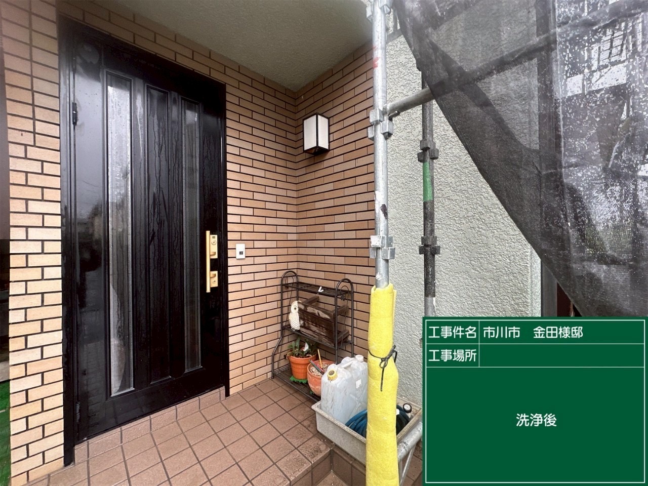 外壁塗装を始める前に、まずは高圧洗浄で外壁の汚れをしっかり落としていきます。長年の風雨で付着したホコリやカビ、コケなどを丁寧に洗い流すことで、下地がきれいな状態に整い、この後の塗装が長持ちしやすくなります。高圧の水流で一気に汚れが落ちていく様子はとても爽快で、外壁本来の色合いが少しずつ見えてきます。