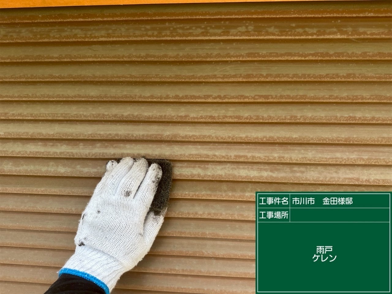 外壁の上塗りが仕上がった後は、雨戸のケレン作業に取り掛かります。ケレンとは、表面に残っている古い塗膜やサビ、汚れを削り落とし、滑らかに整える下地処理のことです。専用の工具を使って丁寧に磨き上げることで、塗料の密着性が高まり、仕上がりの美しさと耐久性がぐんと向上します。見えない工程ですが、長持ちする塗装には欠かせない大切な作業です。