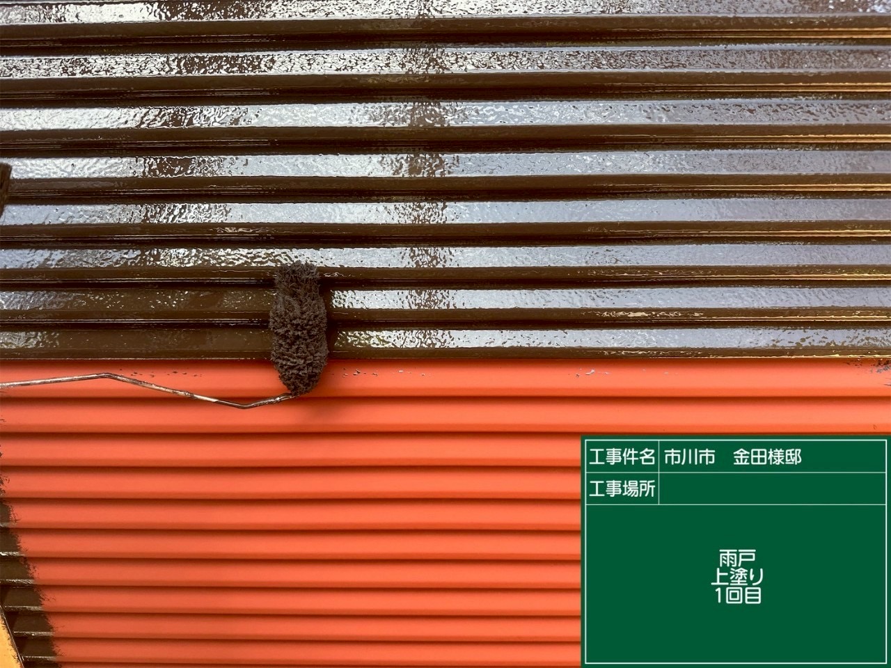 錆止めの乾燥を確認した後、雨戸の上塗り1回目を行います。仕上げ塗料を均一に塗り広げることで、表面にしっとりとした艶が現れ、雨戸の印象が一気に変わっていきます。ローラーや刷毛を使い分けながら細部まで丁寧に仕上げることで、塗料の密着性も高まり、次の塗り重ねに備えた強固な下地が完成します。