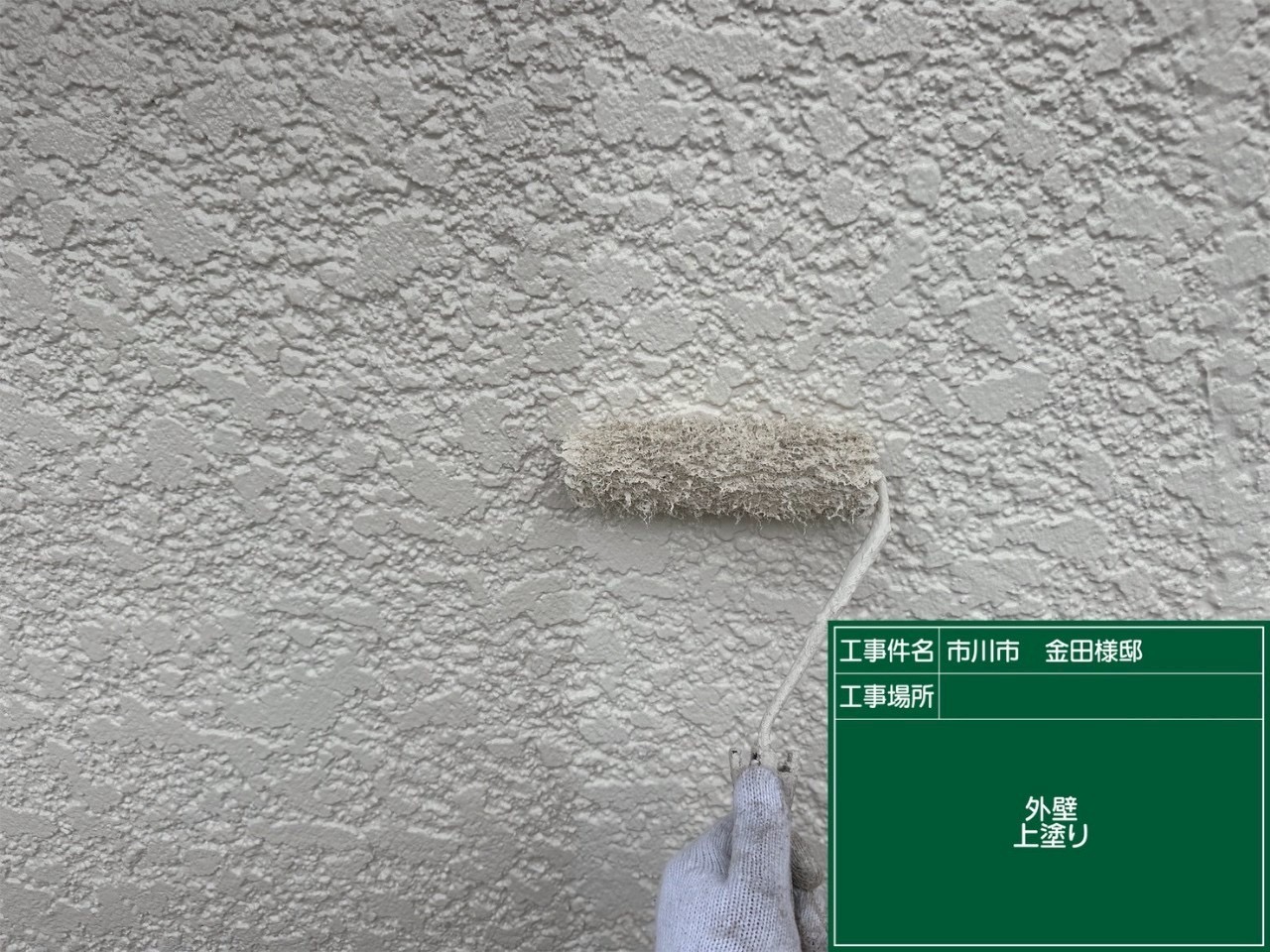 下地補修を終えたあとは、仕上げとなる外壁の上塗り作業に入ります。上塗りでは、選んでいただいた塗料を丁寧に塗り重ねることで、美しい仕上がりとともに強い保護膜を作り出します。ローラーや刷毛を使って細部までムラなく塗り広げ、外壁全体に均一な艶と色合いが生まれていきます。建物の印象が一気に明るくなり、新築のような美しさがよみがえる瞬間です。