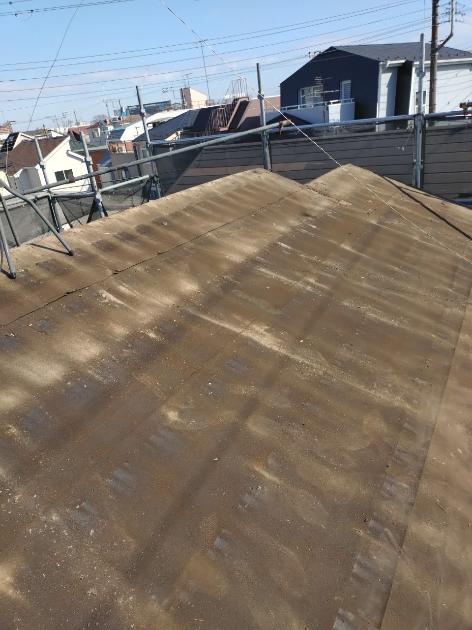 屋根点検でご依頼いただき調査したところ、金属瓦特有の瓦の剥がれが劣化して一部欠けてるところや隙間が目立つのでご心配されている様子。 お家じたいは長年住まれるご予定があるとの事でしたので、まずは屋根材を軽くして長年住めるように耐用年数の高い屋根材を提案し、ご納得いただきご契約に至りました。
