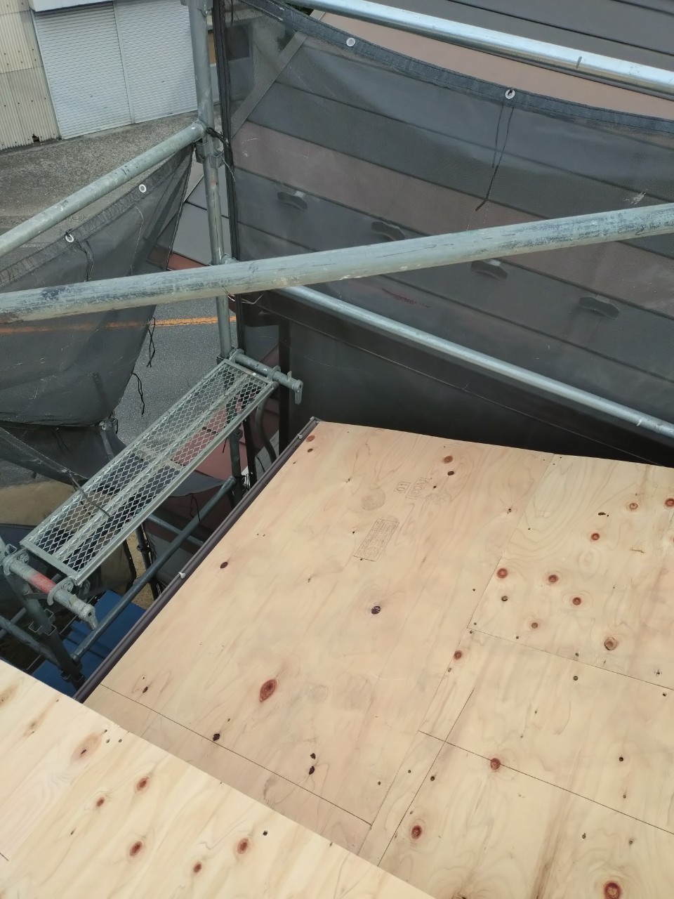 新しい野地板を屋根全体に丁寧に設置している様子です。下地をしっかりと整えることで、この後に施工するルーフィングや屋根材を安全かつ長持ちさせることができます。