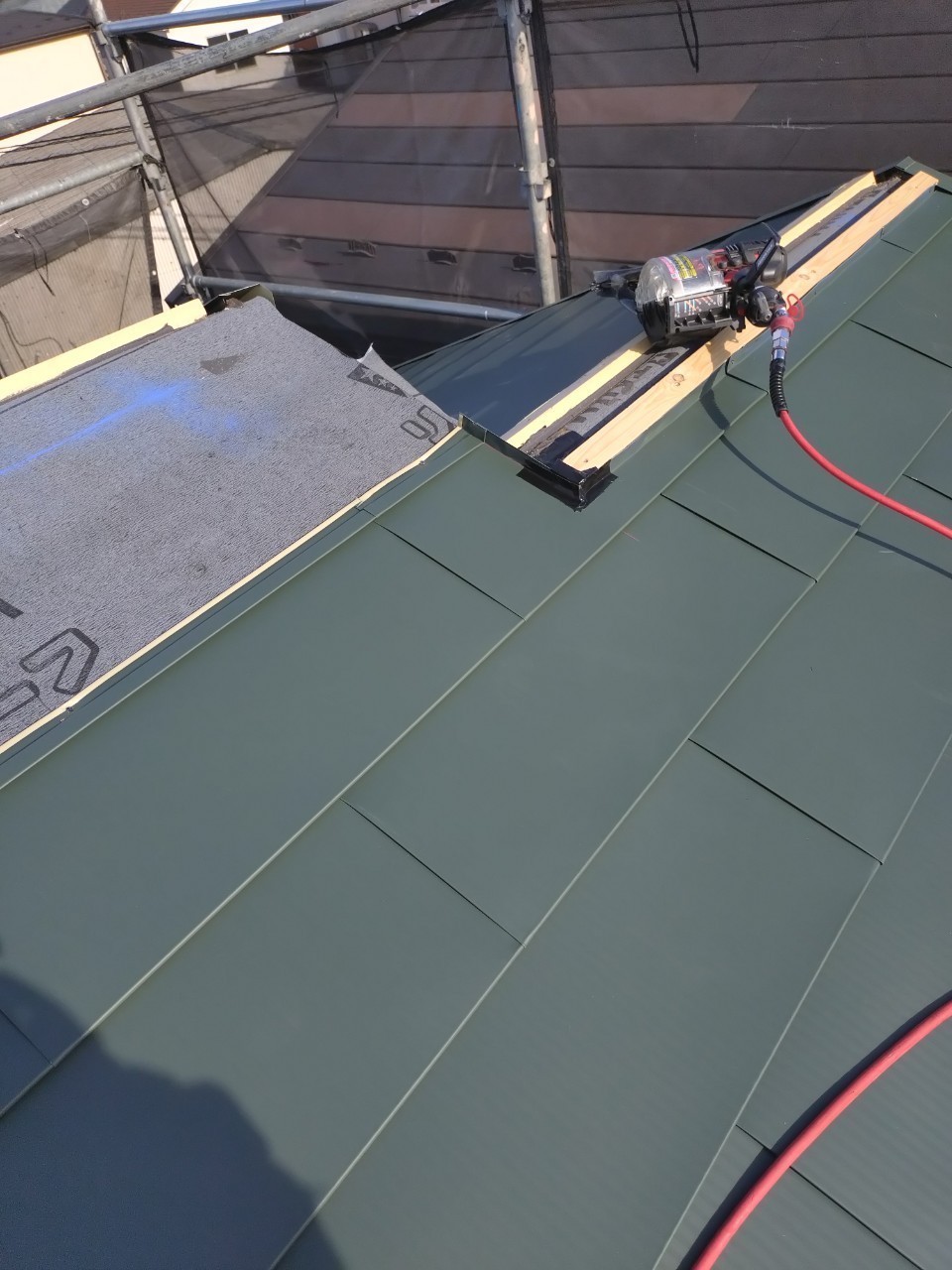 新しい屋根材を一枚ずつ丁寧に設置している様子です。下地やルーフィングをしっかり整えたことで、屋根材が美しく、かつ確実に取り付けられています。精度の高い施工で、耐久性と防水性を兼ね備えた屋根へと仕上げていきます。
