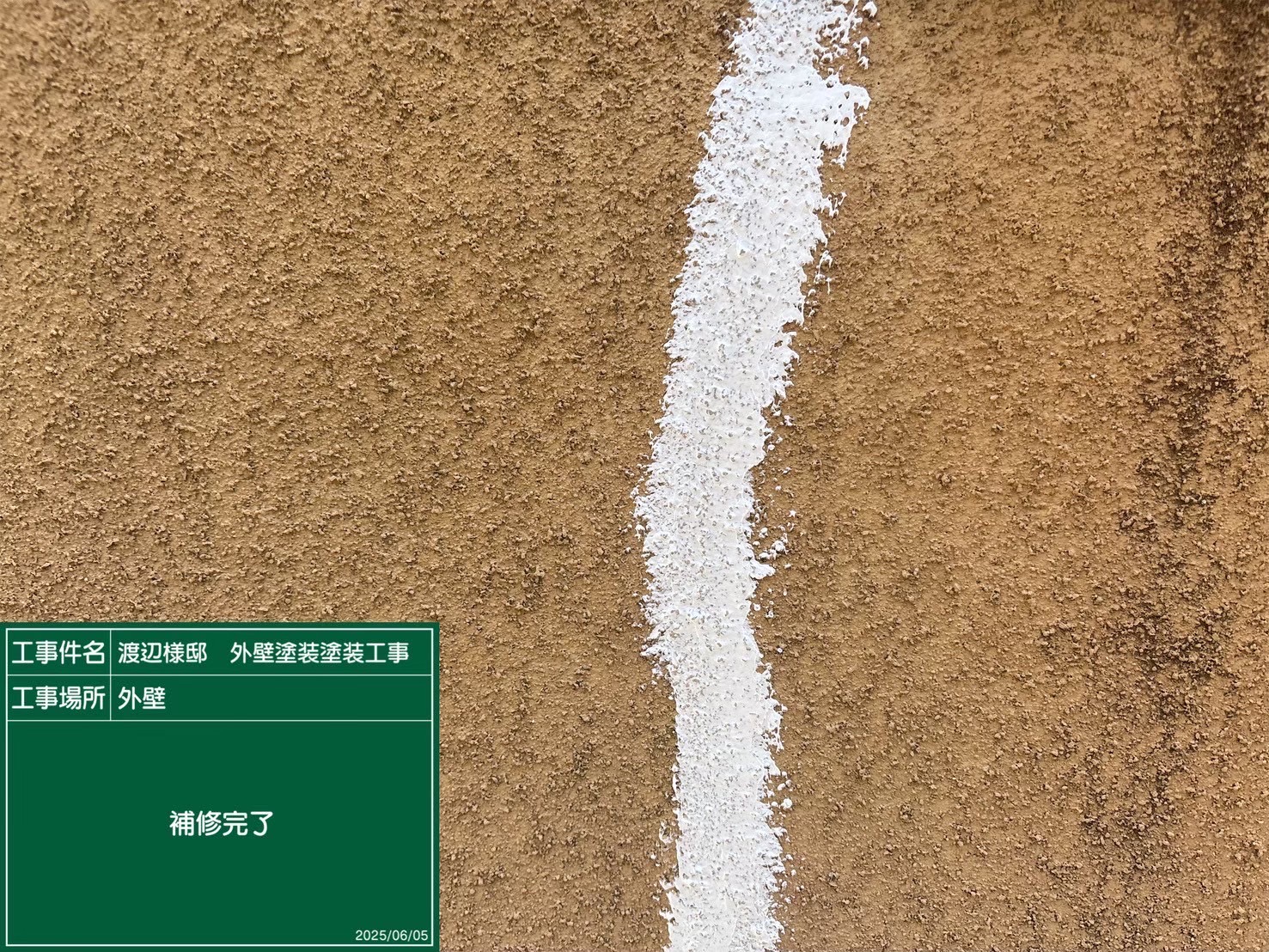 外壁の補修が完了し、ひび割れや欠け、劣化していた部分がきれいに補修材で埋められました。補修箇所は丁寧に整形され、周囲の外壁と違和感のない滑らかな状態に仕上がっています。