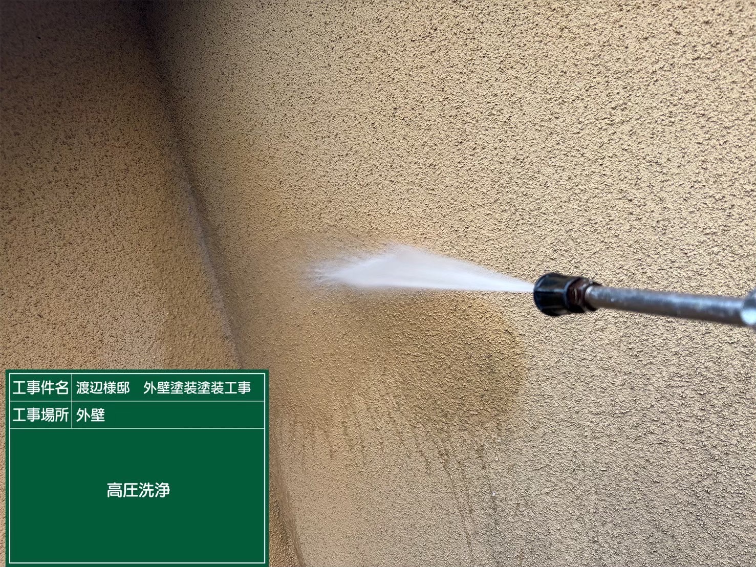外壁の高圧洗浄では、専用の高圧洗浄機を使い、長年蓄積した汚れやカビ、古い塗膜の粉化物(チョーキング)を勢いよく洗い流していきます。水圧を適切に調整し、外壁材を傷めないようにしながら、目地や細かな凹凸部分まで丁寧に洗浄します。