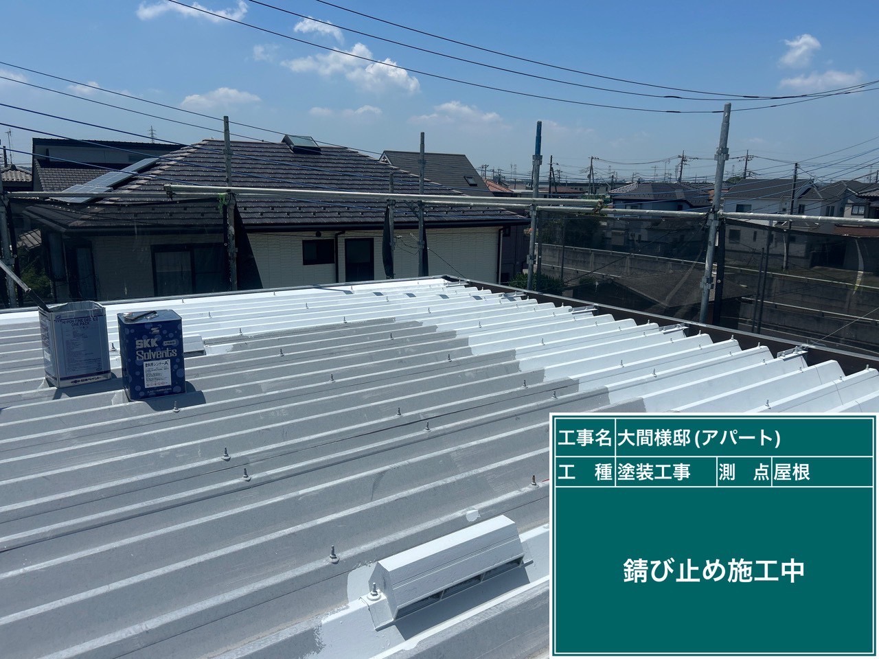 次に、屋根へ錆止めを塗布していきます。 特に金属屋根や金属部材は、雨や湿気の影響でサビが発生しやすいため、錆止めは欠かせない工程です。職人がローラーや刷毛を使い、細かい部分まで塗り残しのないよう丁寧に作業を進めていきます。