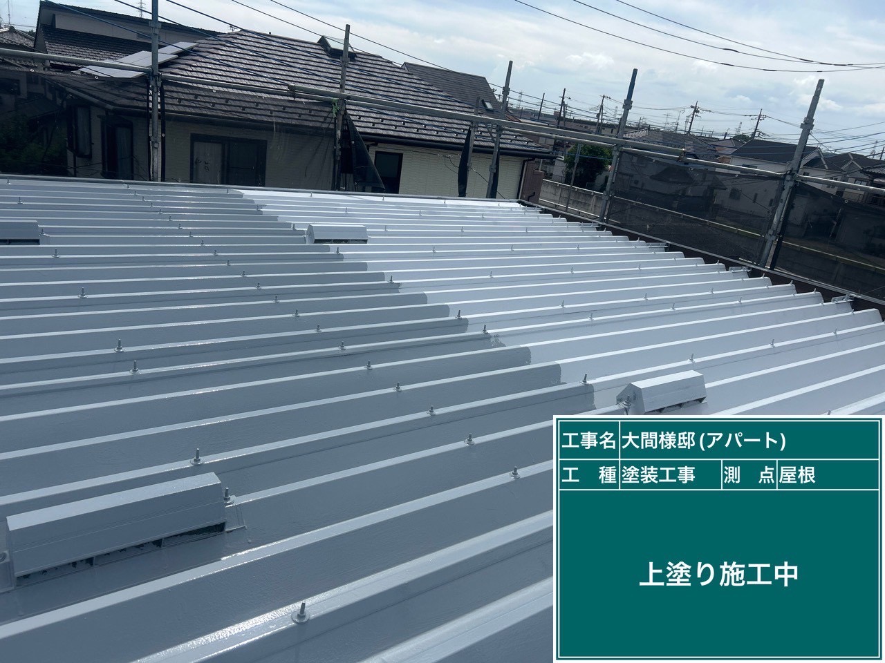 最後に、屋根の上塗りを行っている様子です。 上塗りは仕上げの工程であり、屋根の美観と耐久性を決定づけるとても大切な作業です。職人がローラーを使い、塗りムラや塗り残しが出ないよう、均一に丁寧に塗装していきます。