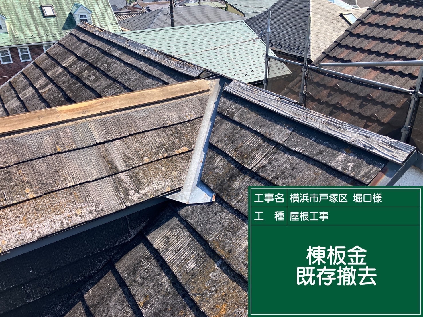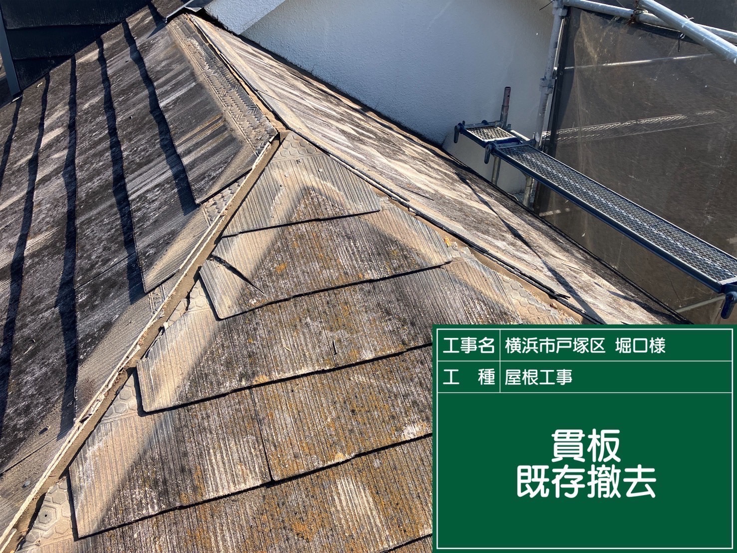 • 次に、既存の貫板を撤去していきます。 長年の風雨で傷んだ木材は一部で腐食が進んでおり、新しい貫板をしっかり固定できるよう、残さず丁寧に取り外しました。撤去後は下地部分の状態を確認し、必要に応じて補修を行う準備も進めています。