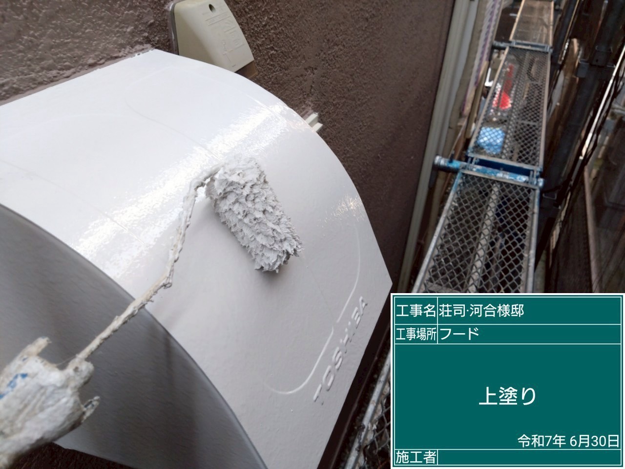 中塗りで整えた塗膜の上に、仕上げとなる塗料を丁寧に塗り重ねていきます。 金属特有の質感を活かしつつ、艶やかで均一な仕上がりを目指して、細部までムラなく施工を進めています。