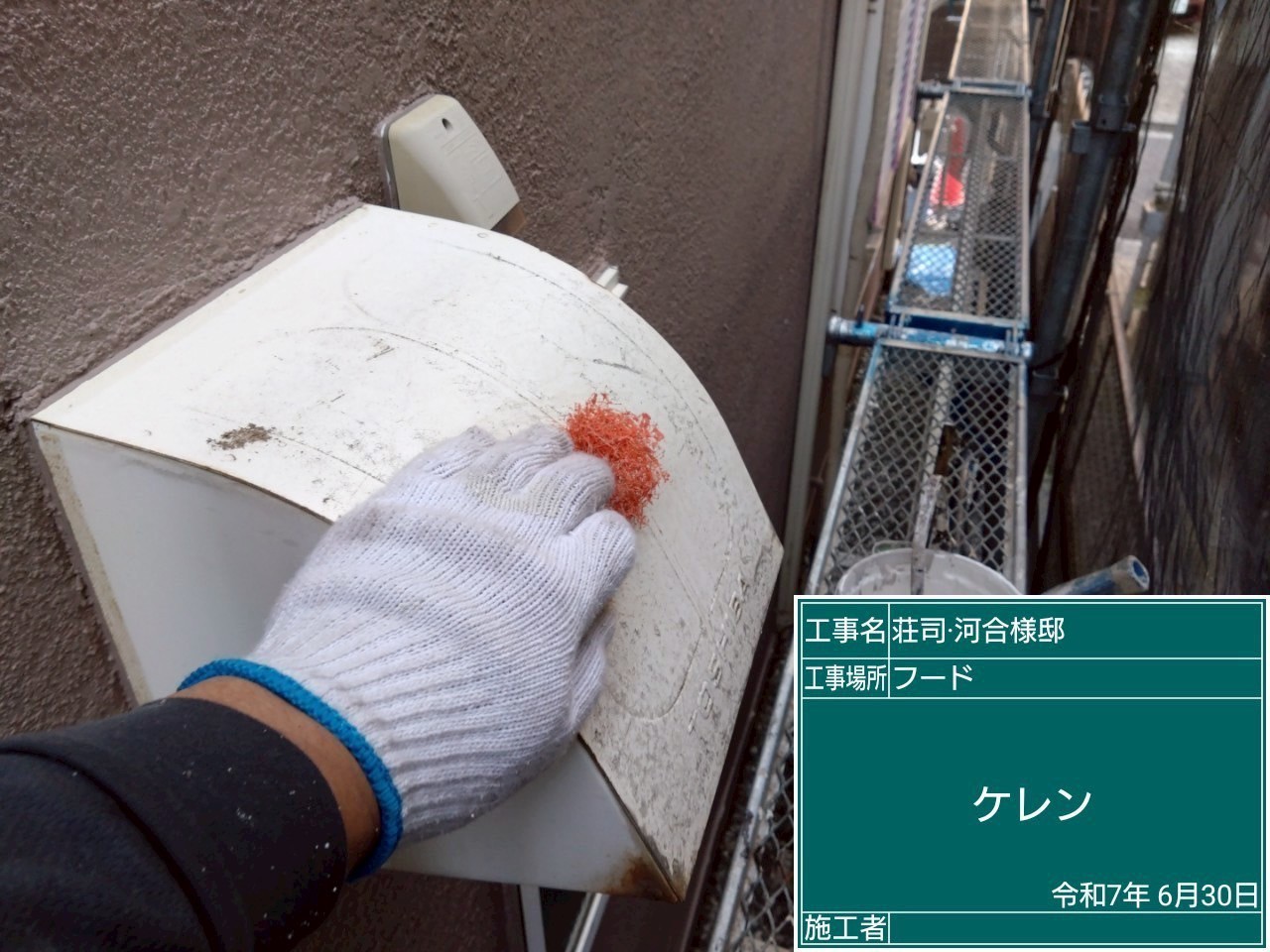 換気フードのケレン作業を行っている様子です。 ケレンとは、塗装前に古い塗膜やサビ、汚れを落として表面を整える下地処理のこと。 金属製の換気フードは特にサビが出やすいため、丁寧にヤスリや専用工具を使って表面を研磨し、塗料の密着性を高めていきます。