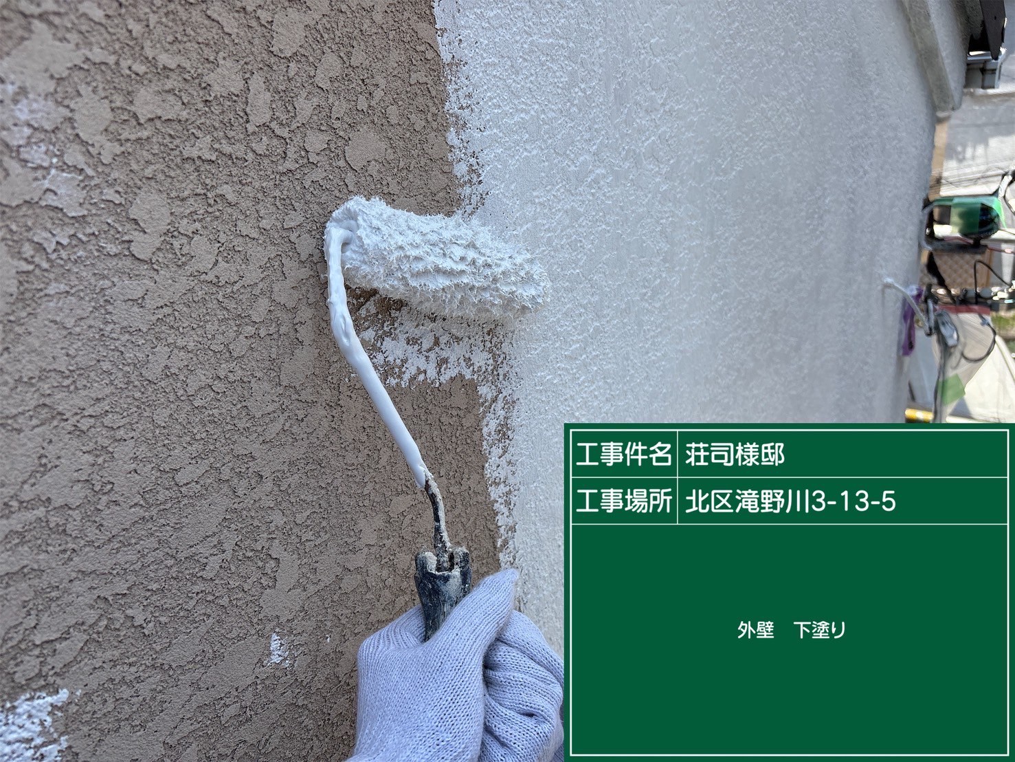 高圧洗浄が完了した後、外壁に下塗りを行っている様子です。 洗浄によって付着していた汚れや古い塗膜がしっかりと落とされたことで、下塗り材が外壁にしっかりと密着し、仕上がりの耐久性を高める準備が整いました。