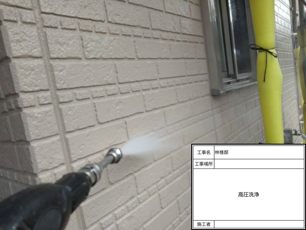 まずは、外壁に付着したホコリやカビ、古い塗膜などを高圧洗浄でしっかりと洗い流していきます。この工程を丁寧に行うことで、塗料の密着性が高まり、仕上がりの美しさと耐久性にも大きく影響します。