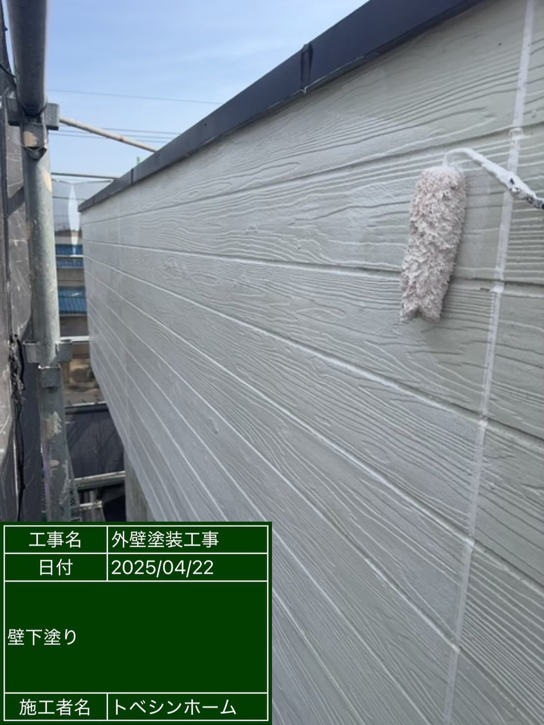 下塗りは、外壁材と上塗り塗料の密着性を高めるための重要な工程です。 下地の状態に合わせた下塗り材(シーラーやフィラーなど)を使い、塗料がしっかり定着するよう丁寧に塗り進めていきます。
