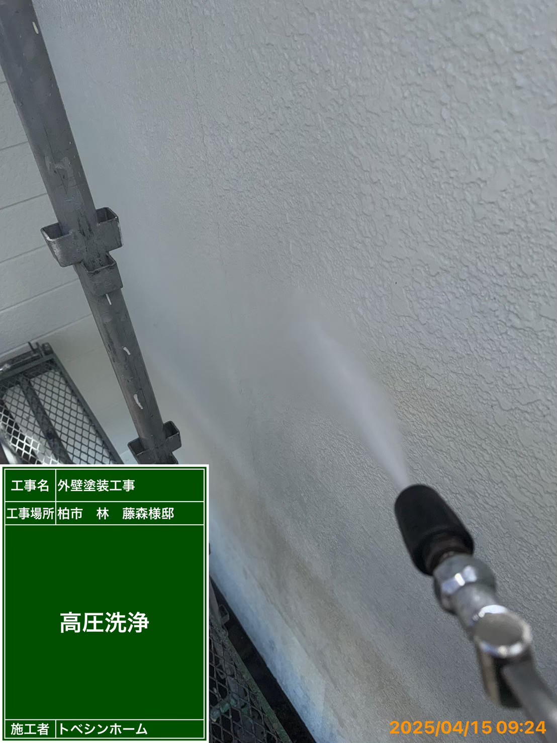 外壁塗装に入る前に、まずは高圧洗浄で外壁全体の汚れを丁寧に洗い流していきます。 長年の風雨で付着したホコリや排気ガス、カビ、コケなどを、高圧の水流を使ってしっかり除去していきます。