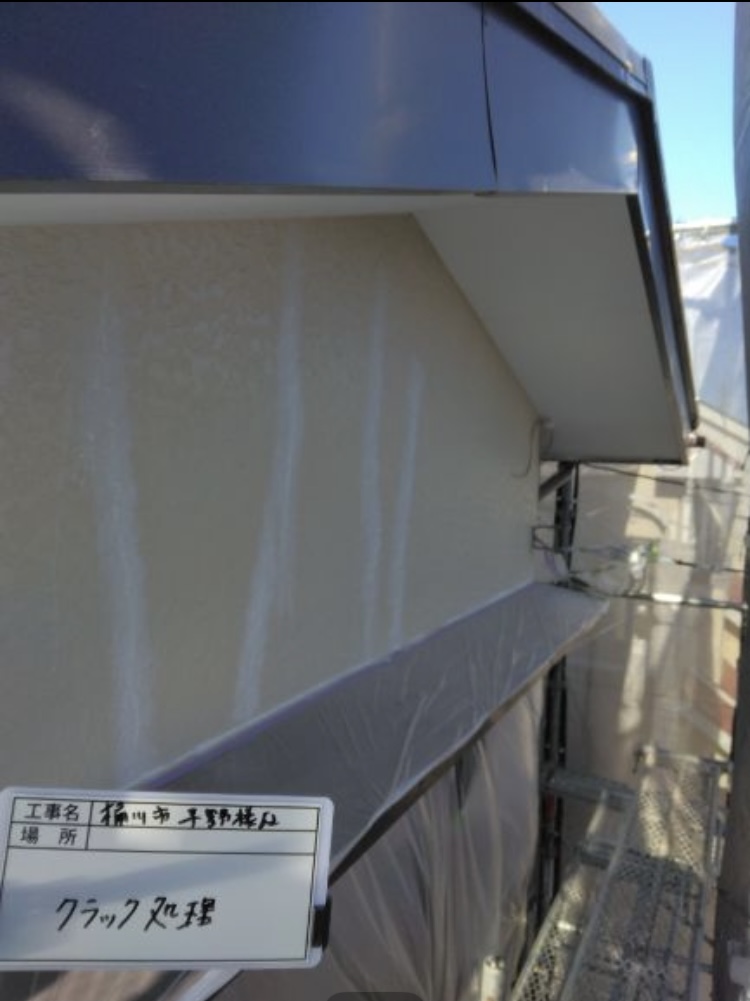 まずは、外壁に発生しているクラック(ひび割れ)の補修を行います。 クラック部分を丁寧に清掃し、専用の補修材を充填してしっかりと埋めていきます。この作業によって雨水の浸入や劣化の進行を防ぎ、塗装後の仕上がりを美しく、さらに長持ちさせることができます。