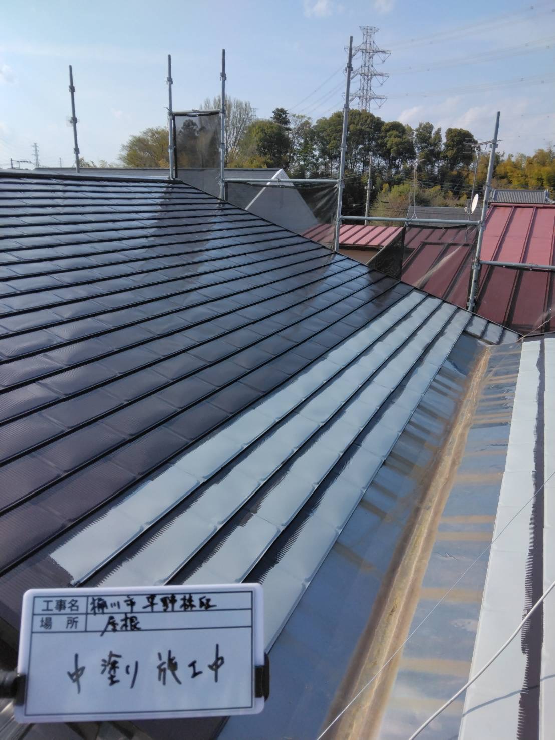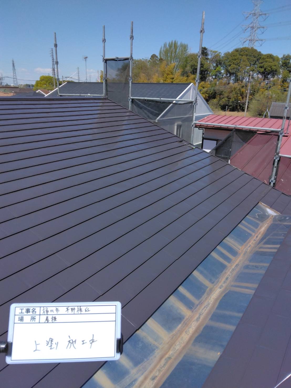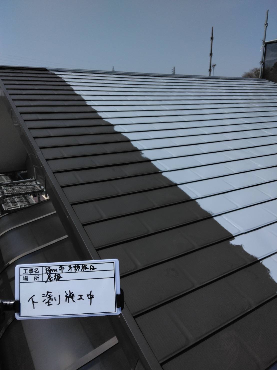 屋根の下塗り作業では、専用の下塗り材(シーラー)を丁寧に塗布していきます。 下塗りは、古い屋根材と新しい塗料をしっかり密着させる大切な工程です。細かい部分までローラーや刷毛を使い分けながら均一に塗り広げることで、後の中塗り・上塗りが美しく仕上がり、塗装の耐久性も大きく向上します。