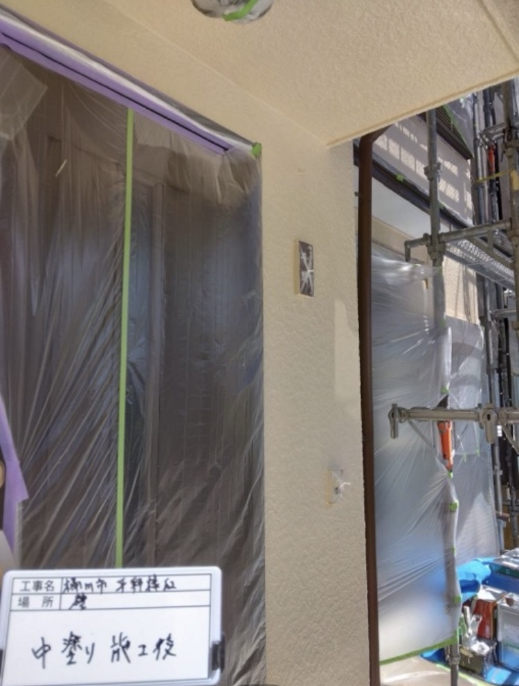 次に、外壁の中塗り作業を進めていきます。 下塗りで整えられた下地の上から、中塗り塗料を均一に塗布することで、外壁の色合いと質感をしっかりと出していきます。中塗りは仕上げの上塗りを美しく見せるための大切な工程であり、塗膜の厚みを確保することで耐候性や防水性も高められます。