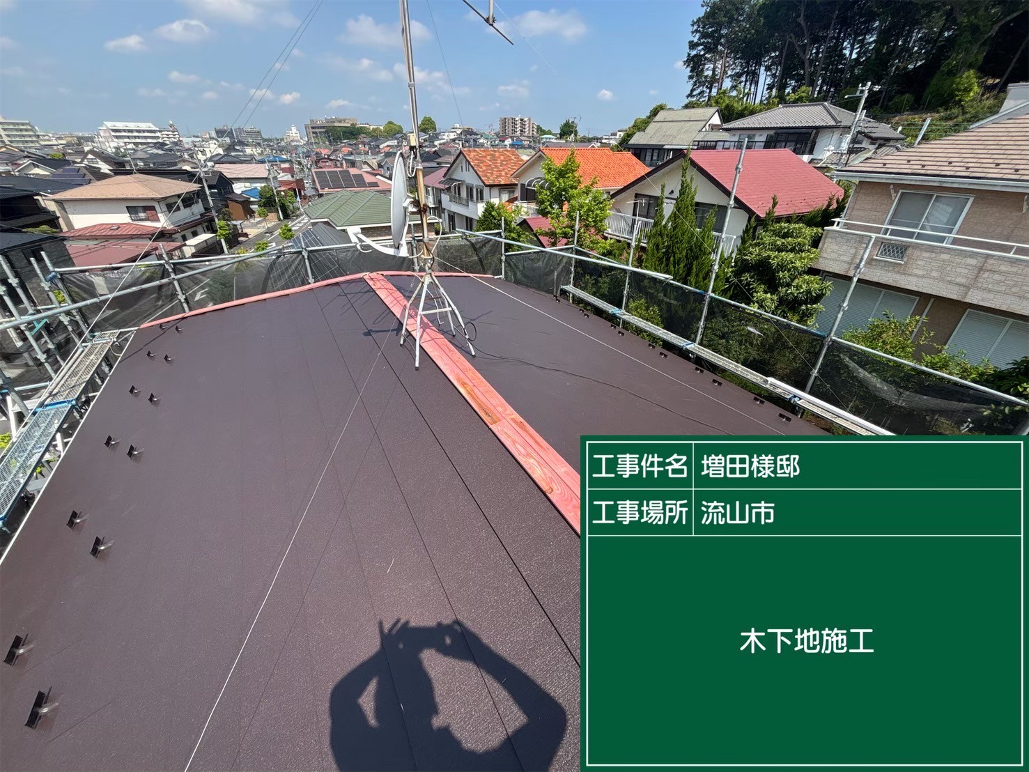 次はルーフィング(防水シート)の新規設置を行います。雨水の侵入を防ぐ重要な工程で、屋根全体を覆うように隙間なく丁寧に張り進めていきます。重ね幅やシワの有無など細部にまで注意を払いながら、確実な防水層を形成していきます。