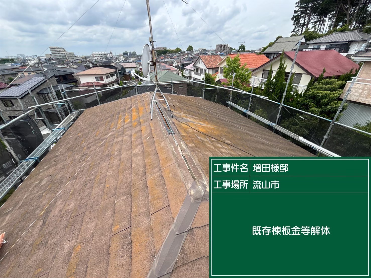 屋根カバー工事の最初の工程として、既存の棟板金の解体作業を行っています。風雨にさらされ劣化が進んでいる棟板金を一つひとつ丁寧に取り外し、下地の状態を確認しながら慎重に作業を進めていきます。