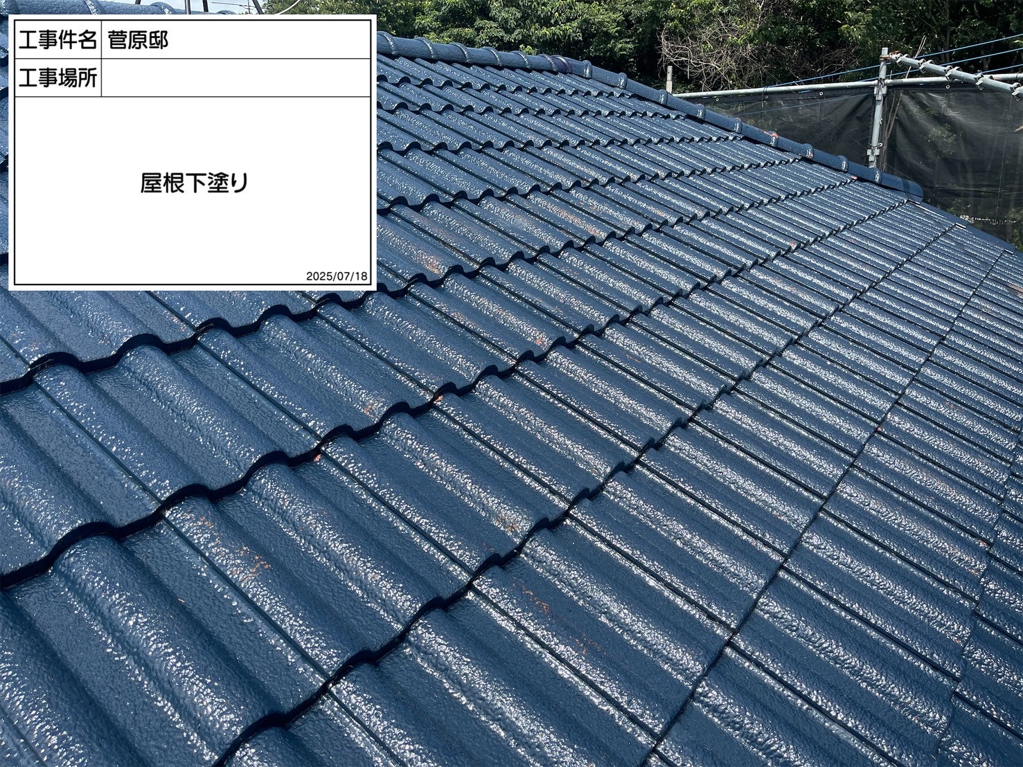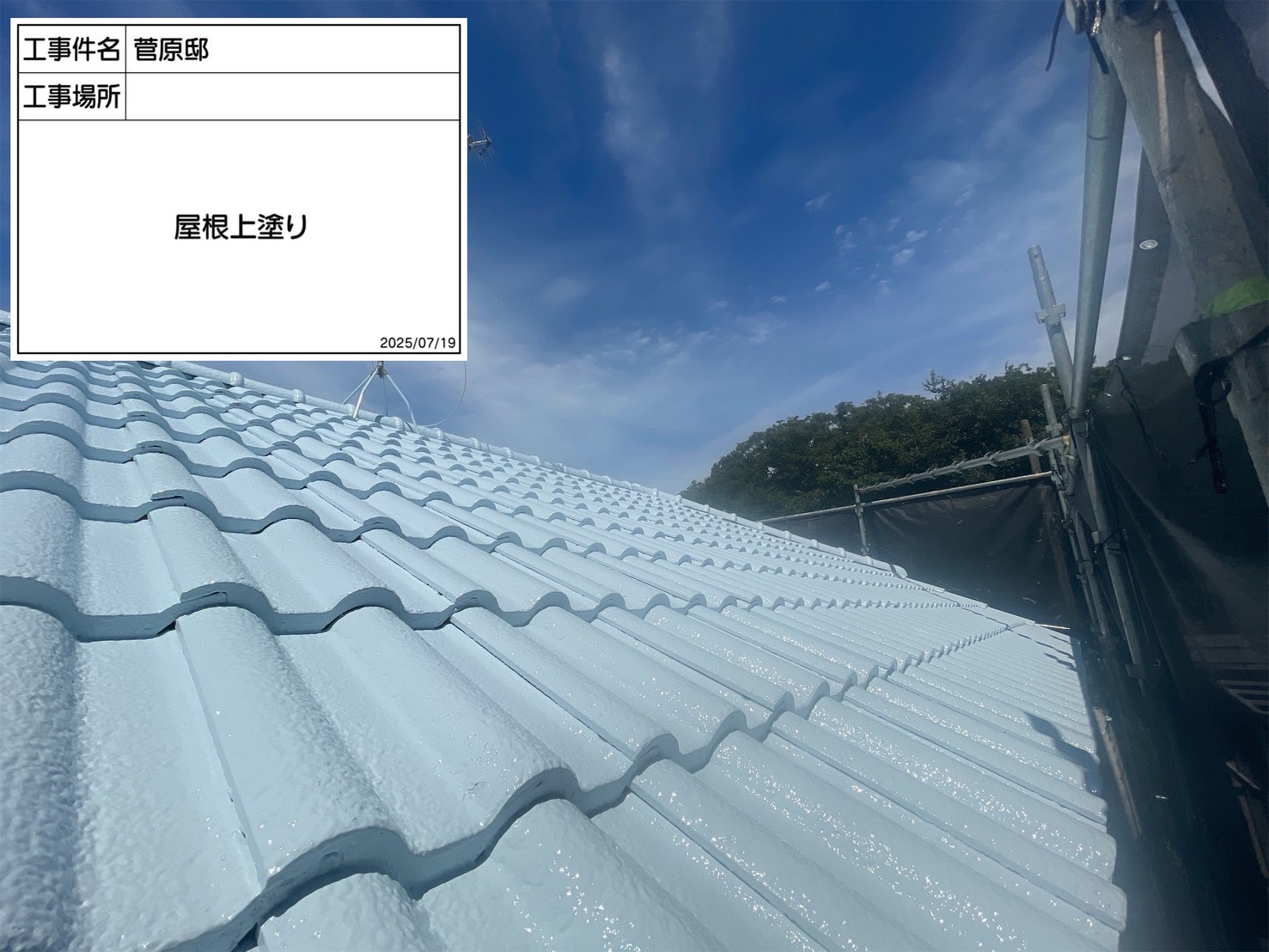 中塗りは、屋根の色味や塗膜の厚みを整える重要な工程です。選定した上塗り塗料と同じものを使用し、均一な厚みになるよう丁寧に塗装していきます。