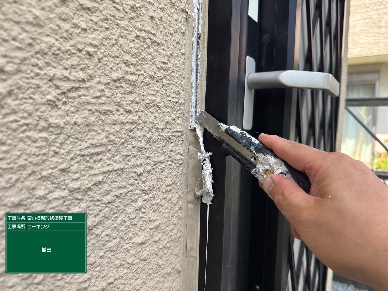 外壁の隙間やひび割れ部分に残る古いコーキングを、職人が慎重に取り除いていきます。専用のカッターや工具を使い、古い素材を丁寧に削り取ることで、新しいコーキングの密着を妨げる要素を完全に除去します。