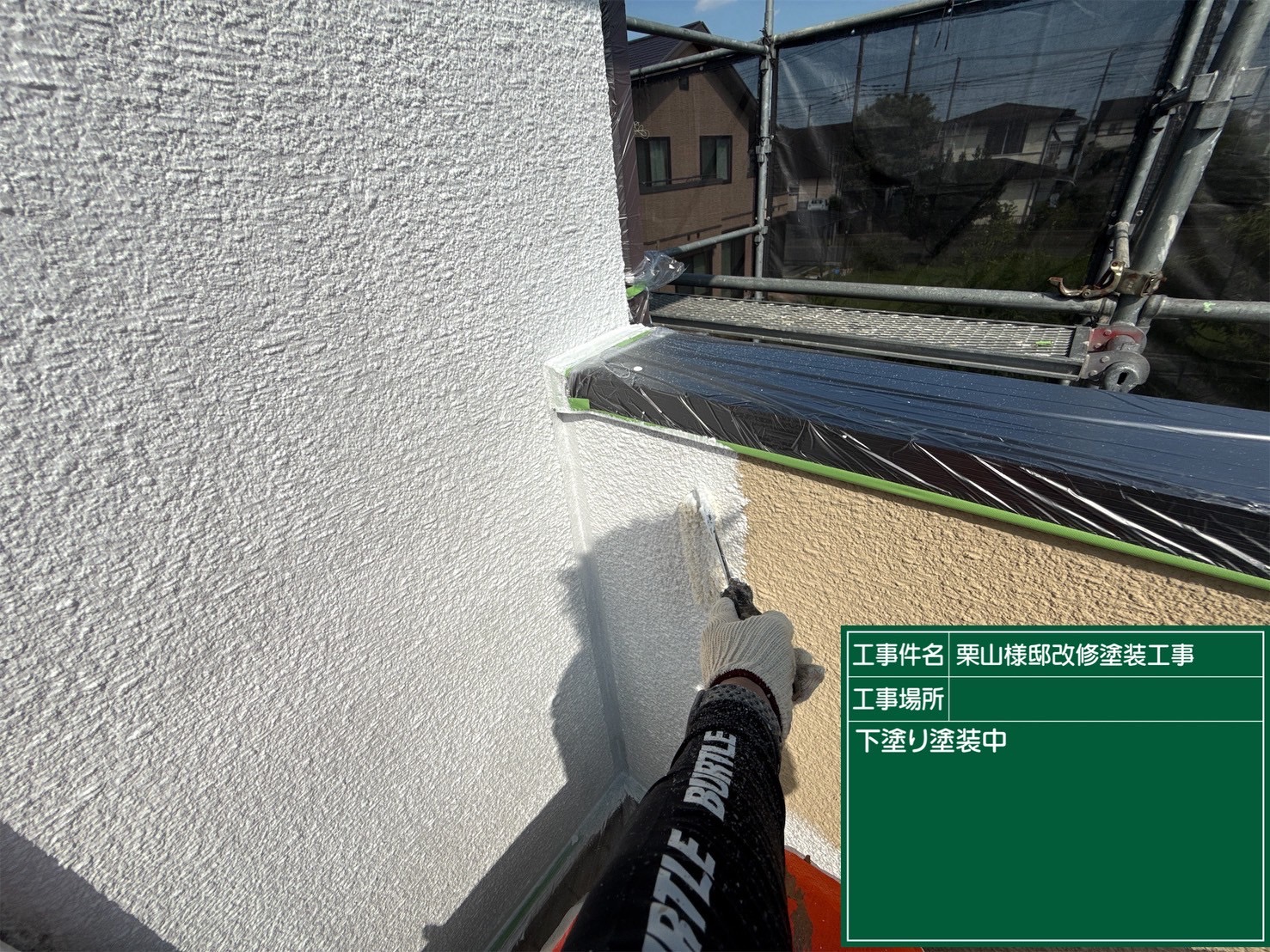 下塗りは、外壁の表面を均一に整え、上塗り塗料の密着を高める重要な工程です。細かいひび割れや凹凸部分にも注意を払い、隅々まで塗料が行き渡るよう慎重に作業。下塗りが完了すると、外壁の素材が塗料にしっかりと馴染み、上塗りの仕上がりがより美しく、耐久性の高い塗装の基礎が整いました。