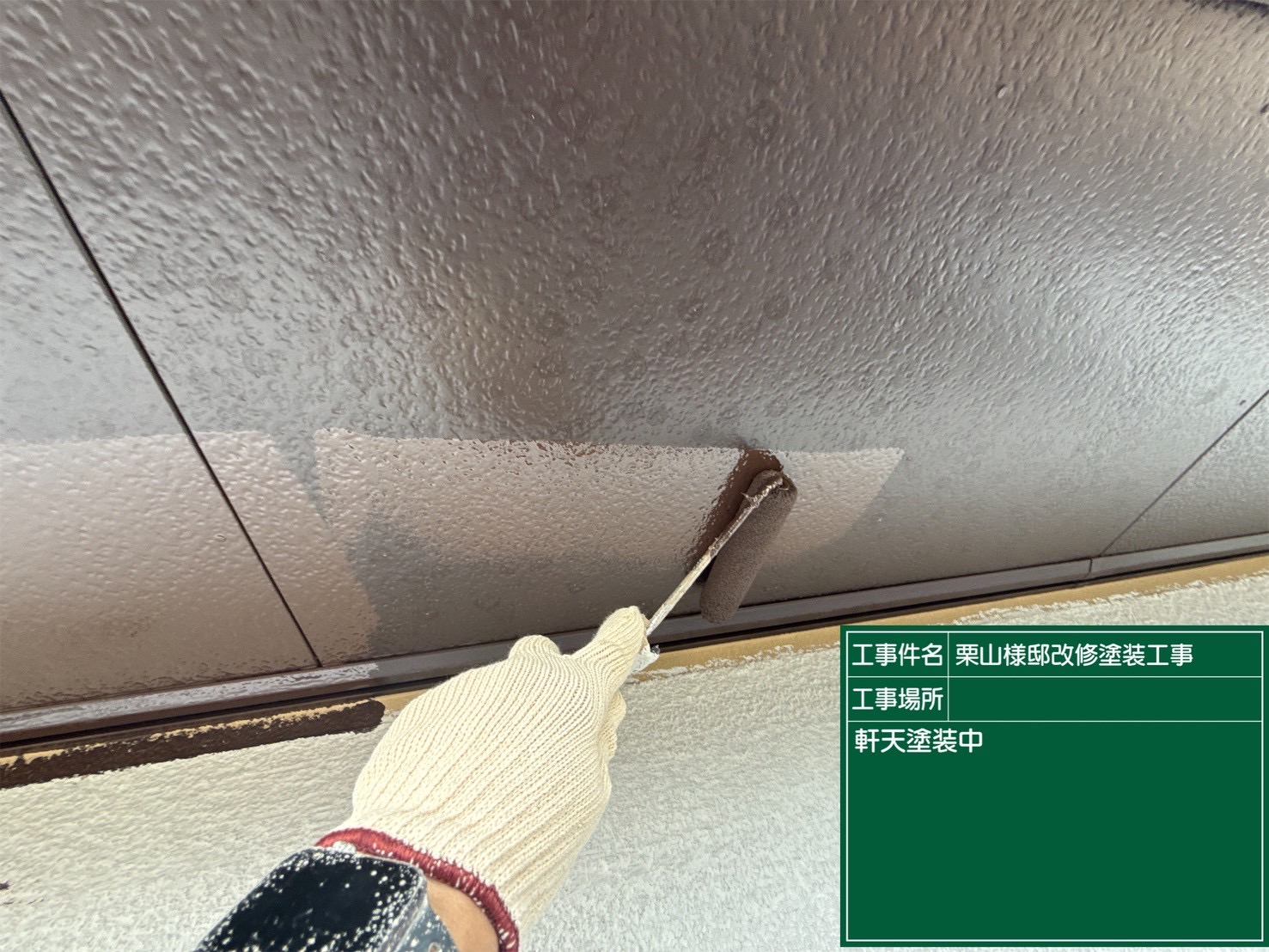 職人がローラーを手に、軒天の表面に丁寧に塗料を塗り広げていきます。軒天は屋根の下に位置するため、塗りムラが出やすい箇所ですが、職人は角や端まで注意深く塗装。1回目の塗装で下地の微細な凹凸を埋めながら、塗膜の土台を作ります。